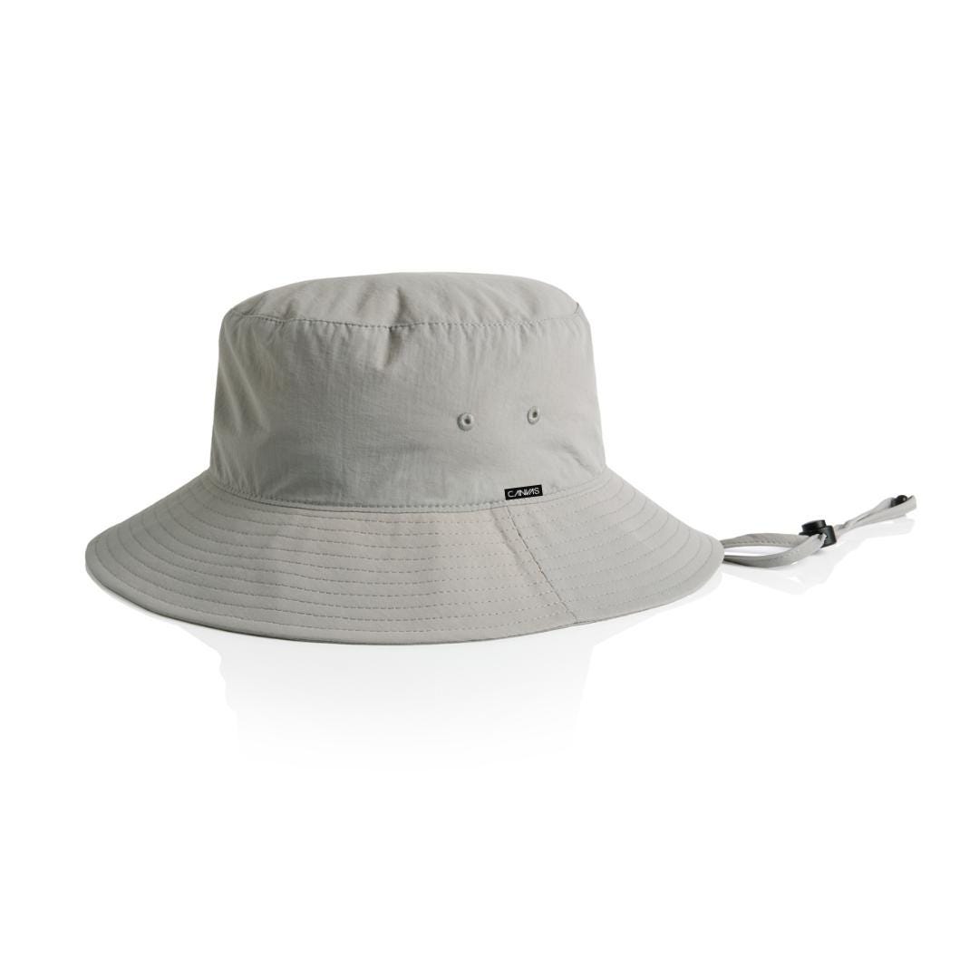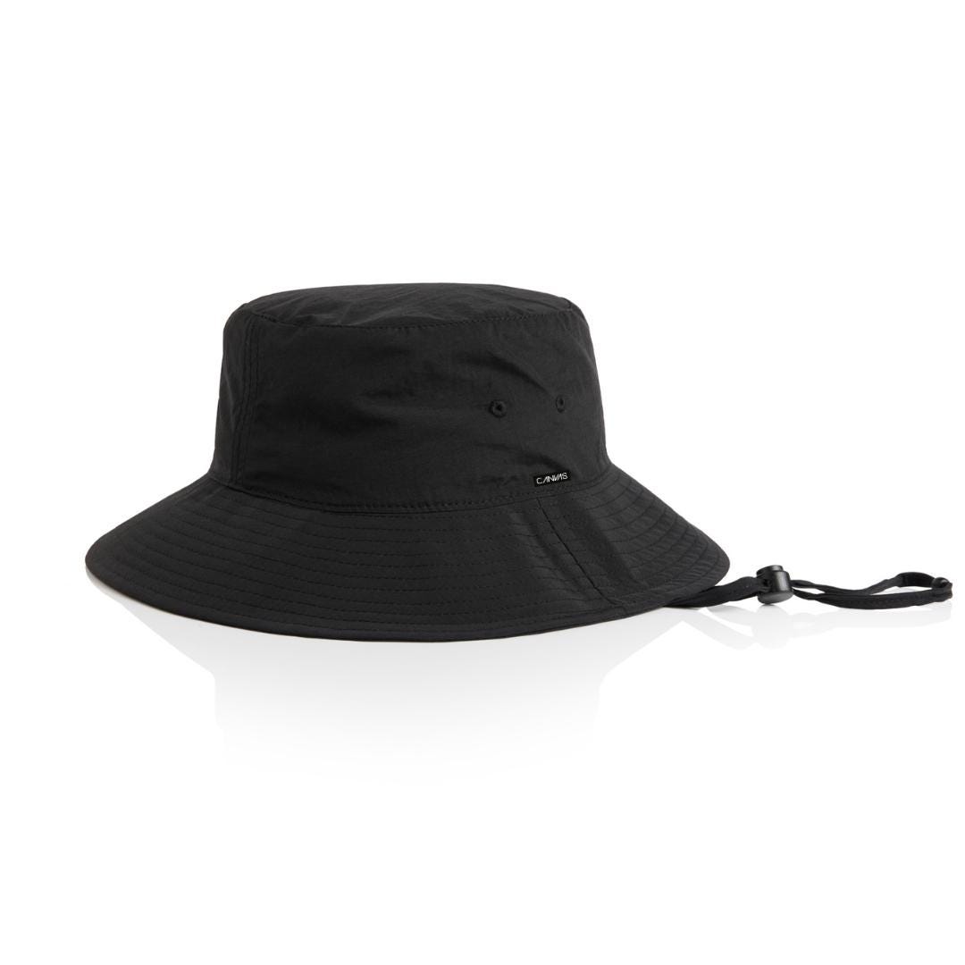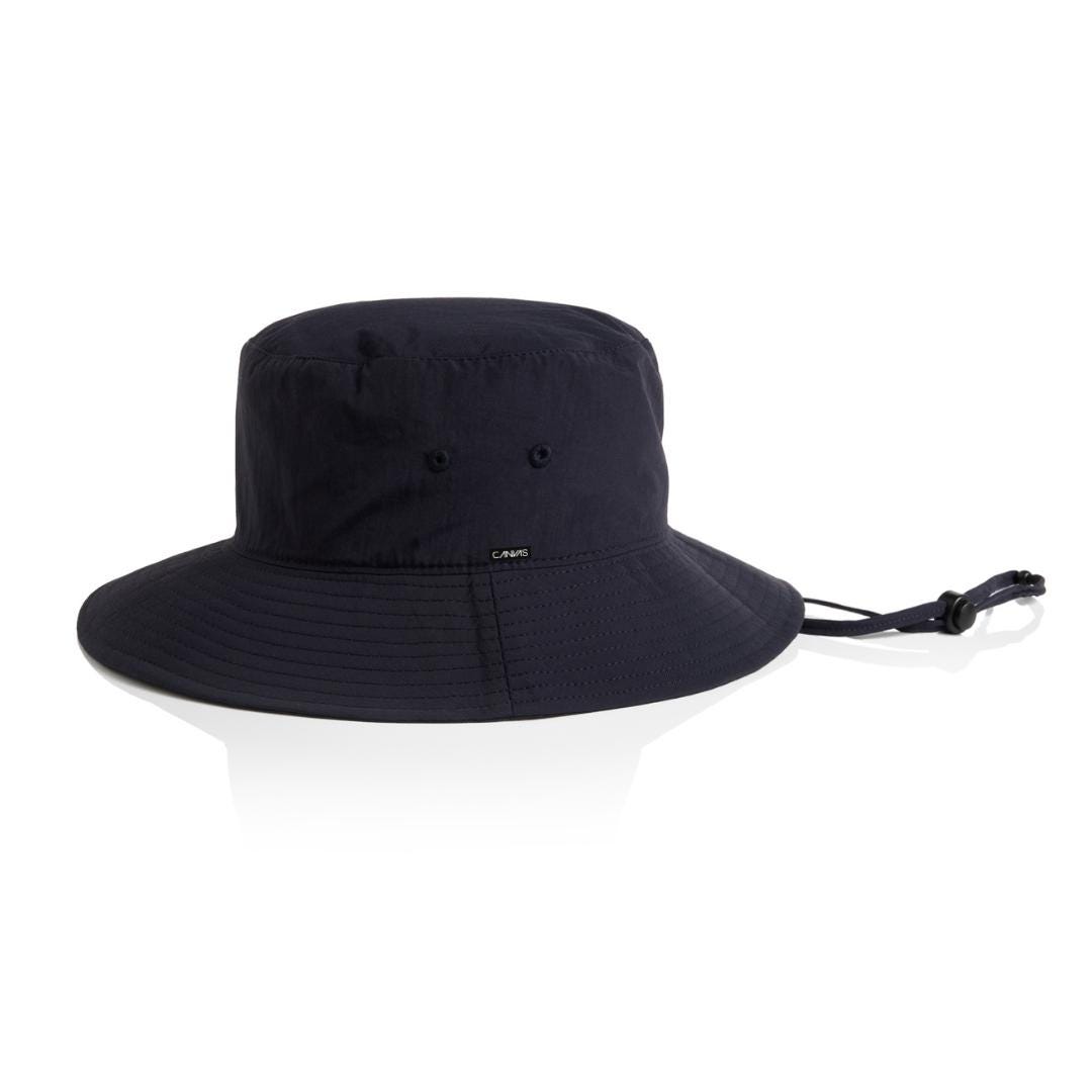 Construction - Reinforced large brim with stitching detail, side eyelets, self-fabric chin strap, plastic adjustable toggle. One size fits all.